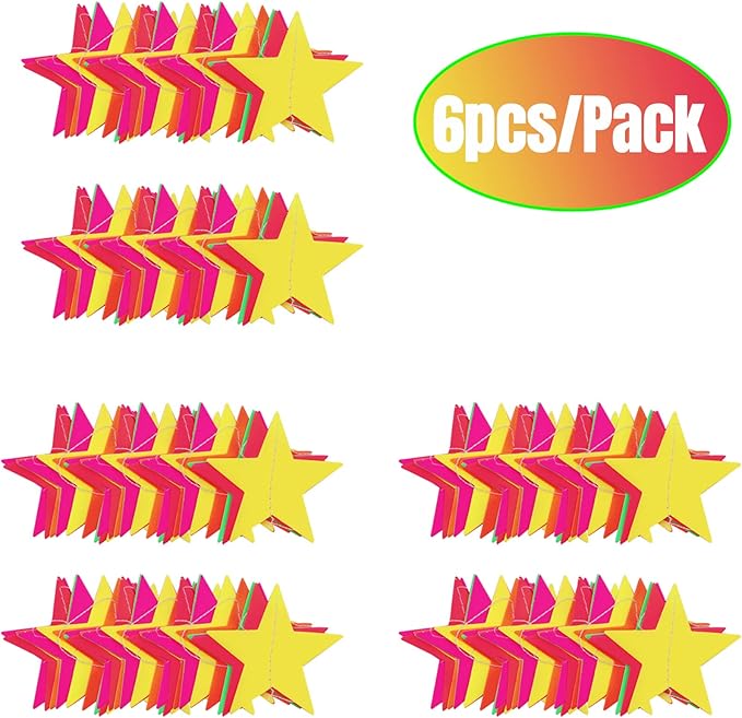 - 【What you can GET】Package Includes: 6 packs of 18 feet long fluorescent star paper garland, each have 40 Stars, diameter about 2.67inch. These Star Garland Combined with 5 colors, that is pink, orange, green, yellow, and red. which will certainly be a huge hit at any neon theme or glow party