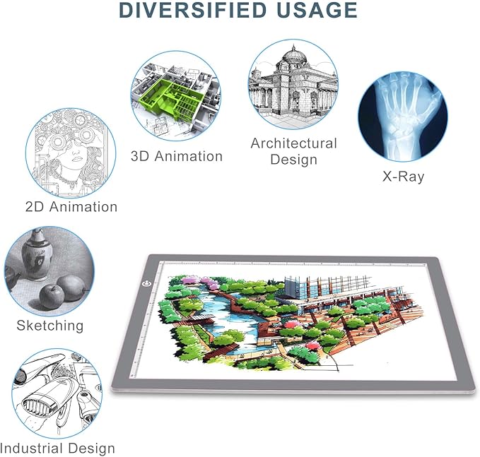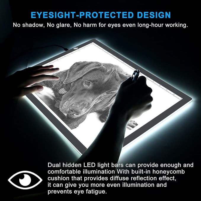 NO SHADOW, NO GLARE, PROTECT EYES. The light pad provids ideal working lighting environment for penmanship and design. Providing the most comfortable lighting environment for animators, designers, art enthusiasts. children and reader.