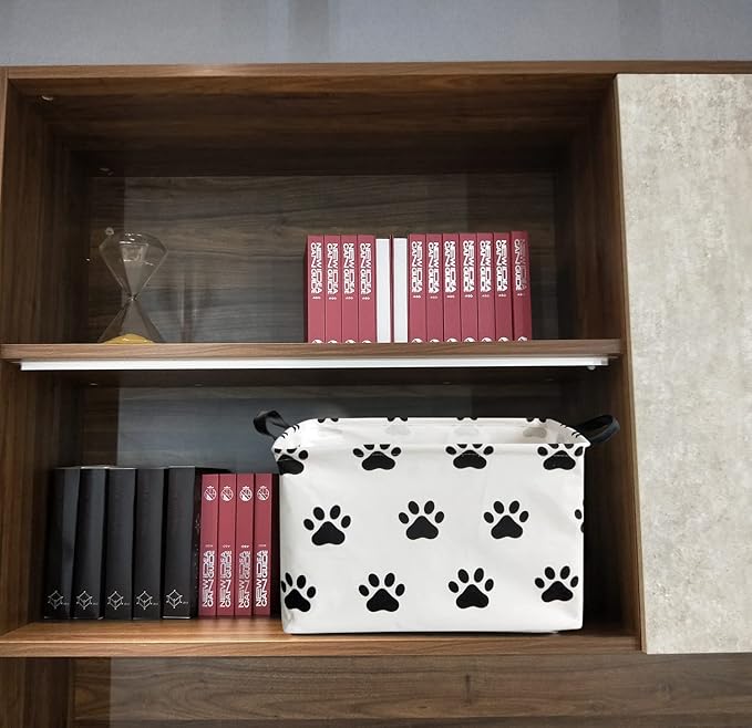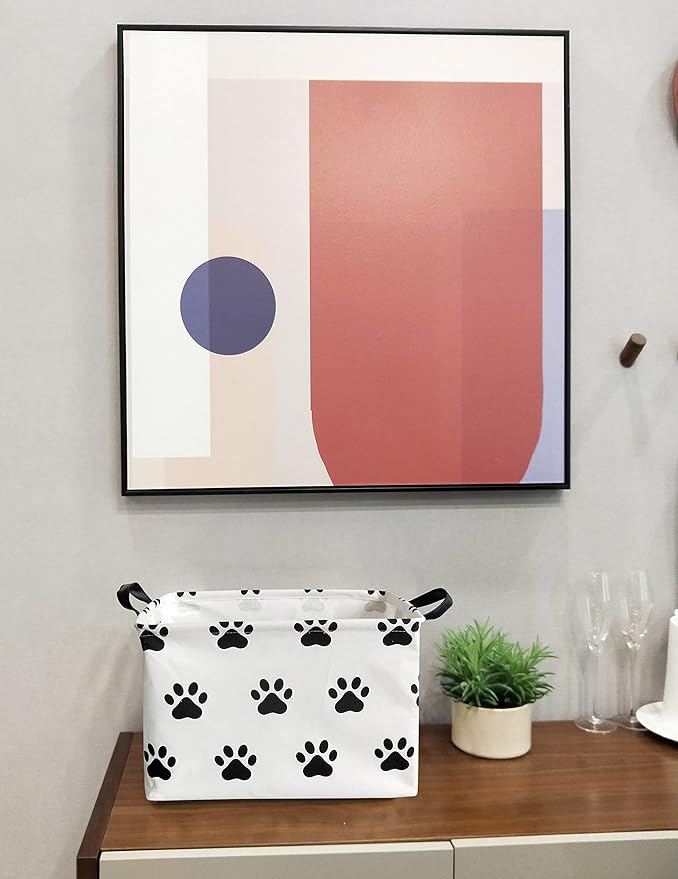 ADVANTAGE OF DESIGN:1.Practical design: Dog toy basket stands when in use and can be folded for space saving and easy storage when you do not want to use it at the time.2.Reinforced handles: Dog toy box has handles on both sides, which is easy to carry.