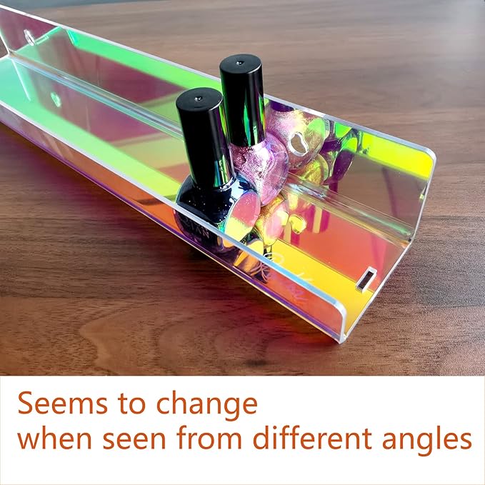 - Iridescent acrylic shelves changes color when viewed from different angles and is a great alternative to boring clear acrylic to add beautiful color to your studio or room.