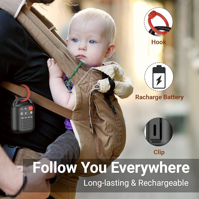 - 🔋【Compact and Portable】 The white noise machine size: 2.75*3.9*1.9 inches, built-in battery, C-terminal charging port, not only safe to use but also durable. With clips and hooks, the sound machine can be easily clipped to your pocket or hung on a car seat, stroller, you can take it anywhere you want to go, and you can also enjoy a good night's sleep on the go, allowing you and Babies are more relaxed.