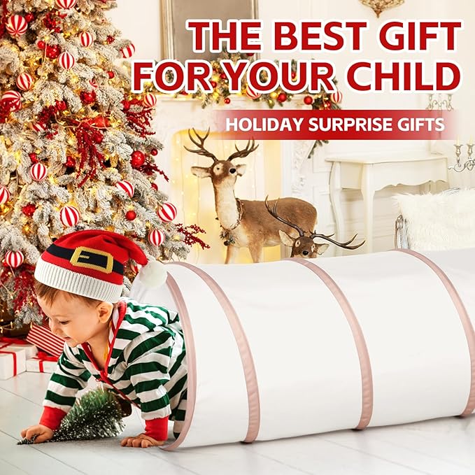 - 【Easy to Assemble】The unique design of this neutral color Crawling Tunnel for kids allows you to quickly open when you need to use our tunnels for babies without wasting a moment of happiness. Based on steel-spring construction, toddlers tunnel folds flat for convenient storage when the baby tent is not in use, and it is easy to carry in a bag, making it the first choice for outdoor activities.