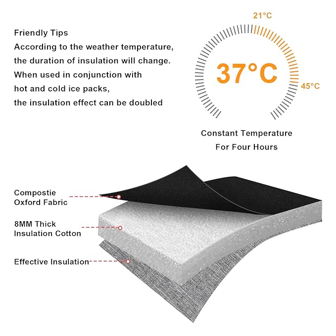 - HIGH QUALITY MATERIALS: Made of high quality water-resistant composite oxford fabric, 8mm extra-thick EPE foam and food-grade aluminum foil liner. No odor, non-toxic, food safe, durable, lightweight. Effectively keep bottles stay cold, warm or fresh for hours, it keeps breast milk fresh.