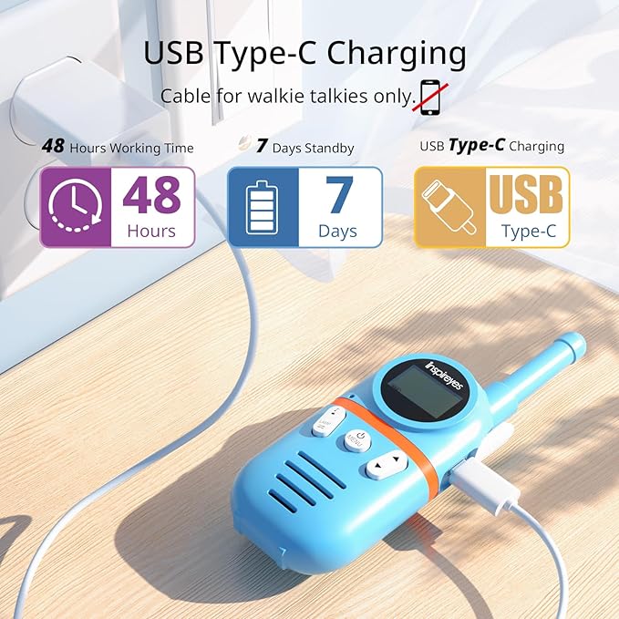 - Inspireyes rechargeable kids walkie talkies are rechargeable and long lasting, featuring an upgraded built-in lithium polymer battery. There is no need to buy extra AAA batteries. Kids can enjoy up to 48 hours of playtime and 7 days of standby on a single charge.