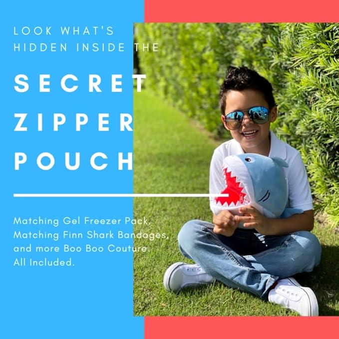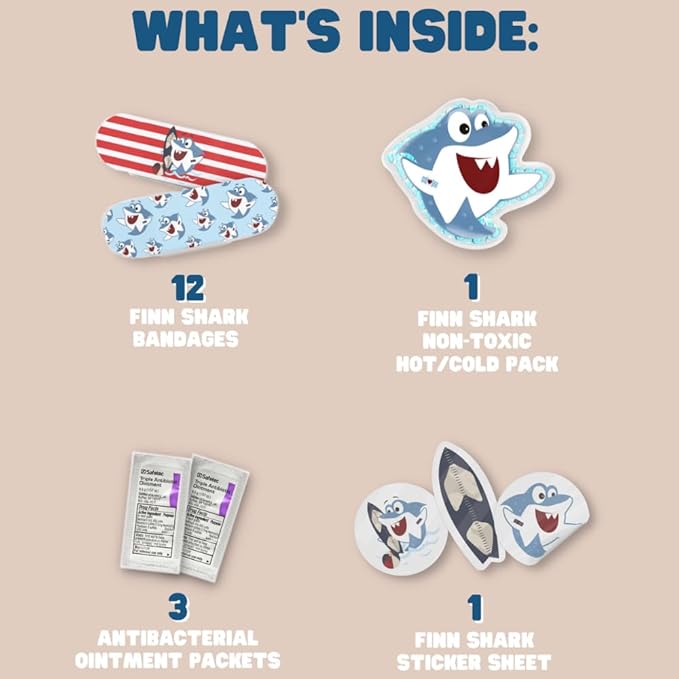 - π¦ΈββοΈ The Set Includes: This kids first-aid kit plush includes 1-character ice pack (for hot & cold use), 12 matching Finn Shark bandages, 6 Finn Shark stickers, and 3 triple ointment packets. This infant first aid kit is packed in a secret zipper pouch on the stuffyβs back.
