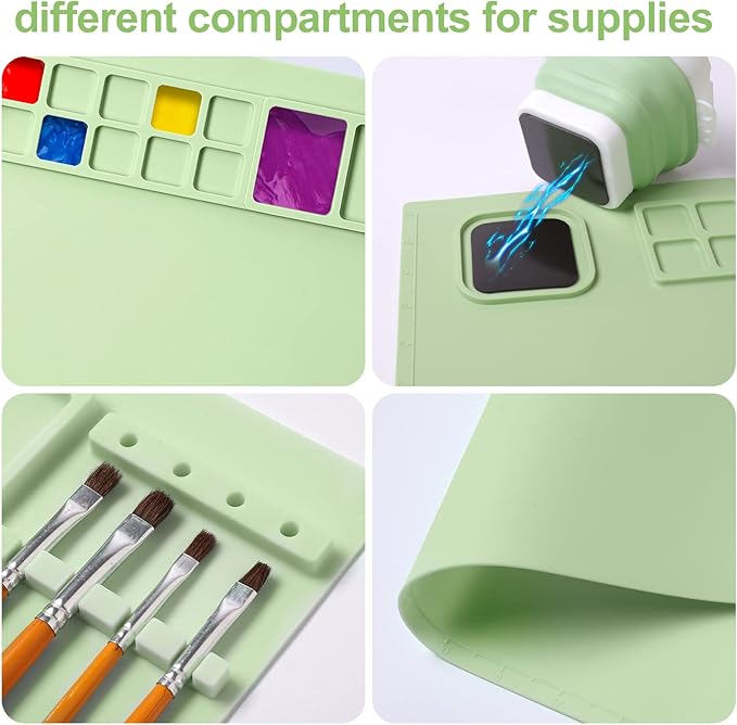 - [LARGE SILICONE MAT]: The size of the silicone artist mat with a water cup is 20Γ16 inches. The slightly raised edge keeps everything on the art mat.