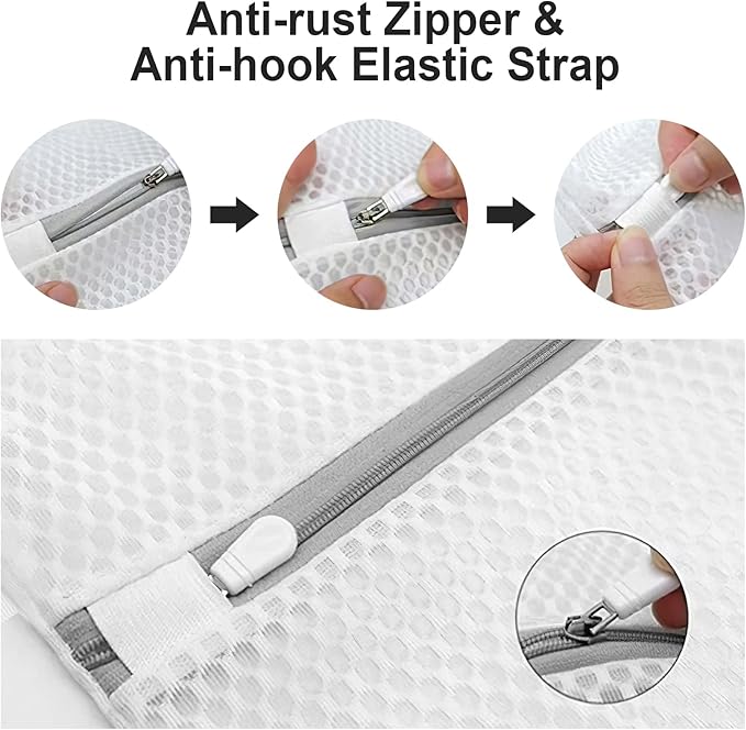 - 【Warm tips】 About 70% of the delicates laundry bag should be filled with clothes. Do not load the washing machine too full, it has a better decontamination ability when it is filled with 70% clothes. Please do not pull the zipper on the mesh laundry bags to the end to prevent the zipper from falling off.