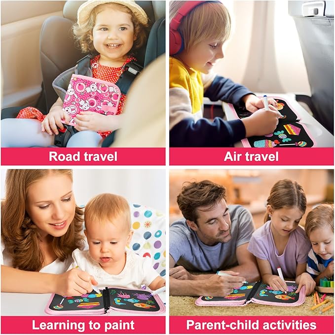 - π¨Kid's Road Trip Essentials--Kids Erasable Graffiti Book has sticky buttons on the outside to keep it in place and a pens pocket on the inside for 12 watercolor pens. Even in cars, planes and other means of transportation, kids can draw as much as they want.