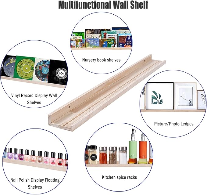 - Ideal for Wall Decor: The size of photo ledges is 48 in x 3.7 in x 1.6 in.This wall floating shelf has no visible floor support, so it makes greater use of your wall space and adds a decorative touch to your home. This wall floating shelf in natural wood color is suitable for various styles of furniture decoration, simple and generous.