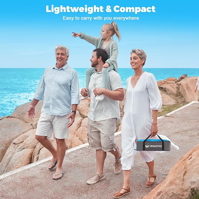 - Easy Set Up & Lightweight: Venustas sun shelter is much easier to fold than a Pop-up tent. Setting up this beach tent is a fast and easy process that can be done in a minute. The unique folding capability of this tent allows it to be taken down and stored anywhere. The folded size of the beach tent is 16.5" x 5.9" x 5.1", weight 6.6 lbs, a lightweight package makes it easy to carry.