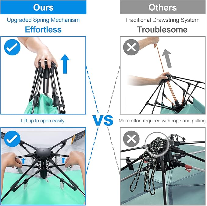 - Easy Setup & Super Stable: The specially designed spring opening system shows an industry-leading level of improvement. One person can set up the beach tent easily in seconds. Compared to the drawstring design, this one is faster, effortless, and saves more time. The 8.5 mm thick fiberglass poles make the tent stronger. Equipped with 3 sandbags, 4 wind ropes and 10 stakes to ensure stability and prevent it from being blown away in the wind.