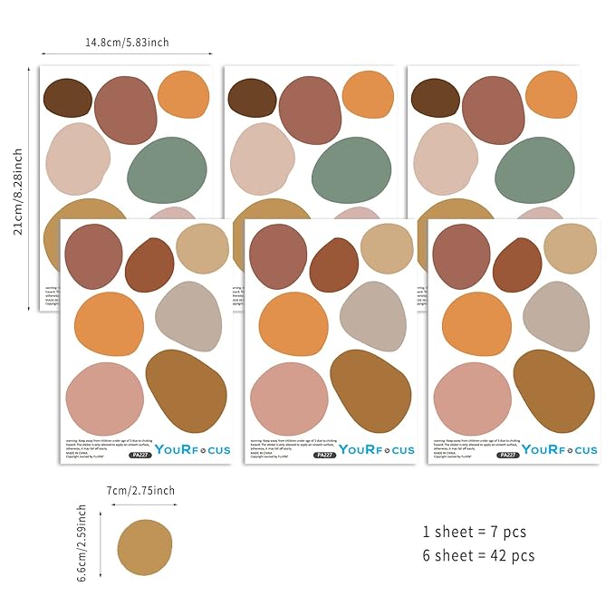 Boho Polka Dot Wall Decals 42 PCS, Boho Wall Sticker for Girls Room Living and Playroom Nursery, Removable Wall Decals Kids Room Decor Vinyl Murals DIY Cute Decorations (6 Sheets)