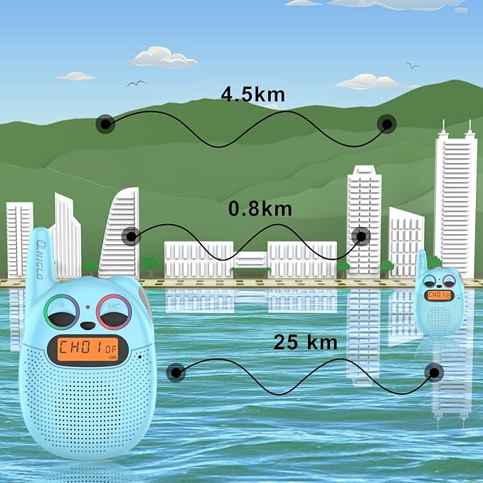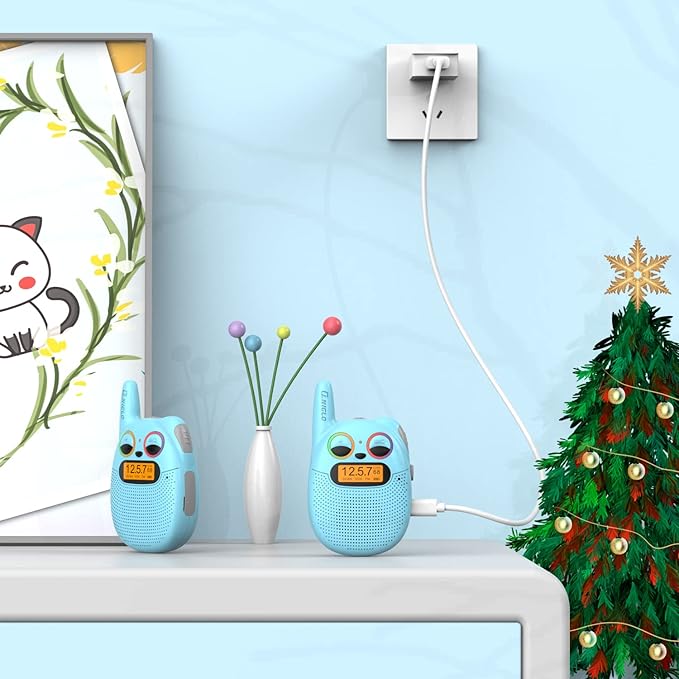 - 𝗖𝗹𝗲𝗮𝗿 𝗦𝗼𝘂𝗻𝗱 & 𝗙𝗠 𝗥𝗮𝗱𝗶𝗼: The rechargeable kid walkie talkies 2 pack feature with FM radio, your kids would search channels and listen to music or real-time news on the FM. The sound is so clear that you could hear each other within 2 miles range.