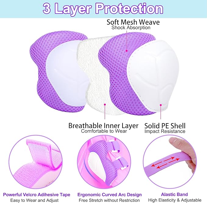- 【Kids Knee Pads and Elbow Pads Set】 The kids bicycle helmet comes with 2 x Elbow Pads, 2 x Knee Pads, and 2 x Wrist Pads. Consist of an anti-scratch extra hard PVC shell for protection, and adjustable velcro straps ensure the protective gear will not shift. A protective gear pad set provides comprehensive safety protection for children.