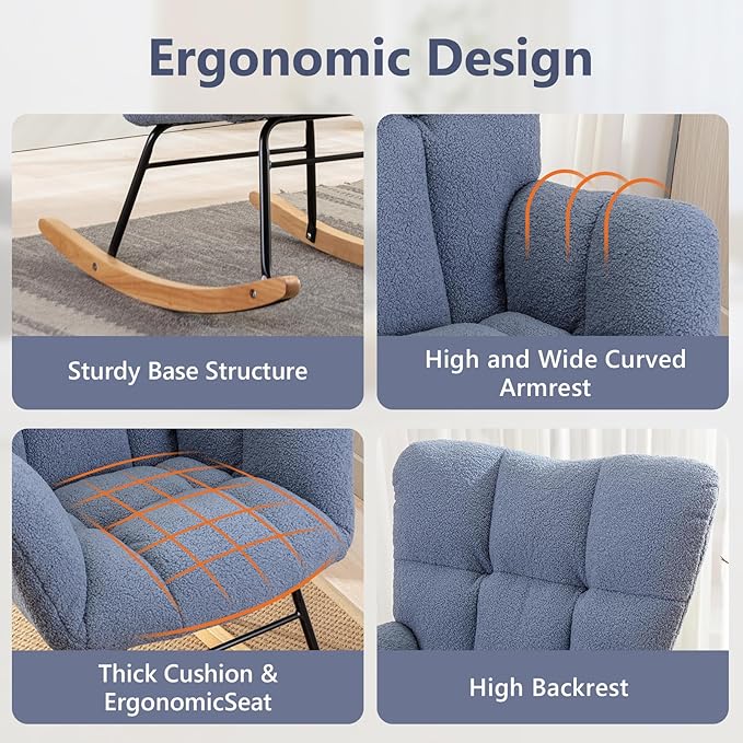 NIOIIKIT Nursery Rocking Chair Teddy Upholstered Glider Rocker Rocking Accent Chair Padded Seat with High Backrest Armchair Comfy Side Chair for Living Room Bedroom Offices (Light Blue)