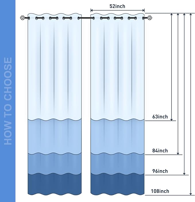 - Package Includes: Set of 2 Blackout Window Curtains; Each panel measures 52" wide x 63" length with 8 grommets top each. Quality fabric feels soft, silky and heavy.