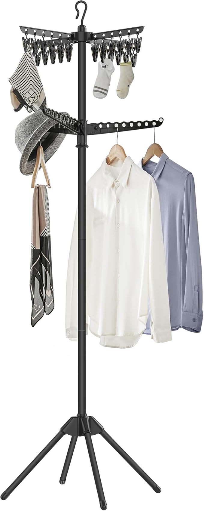 - [Foldable & Space-Saving] Standing at 25.6"D x 25.6"W x 72"H during use, this clothes drying rack takes up little space, perfect for small spaces. Fold the arms and legs into a small size of 2.2"D x 2.2"W x 82.7"H, it will stay out of the way after use