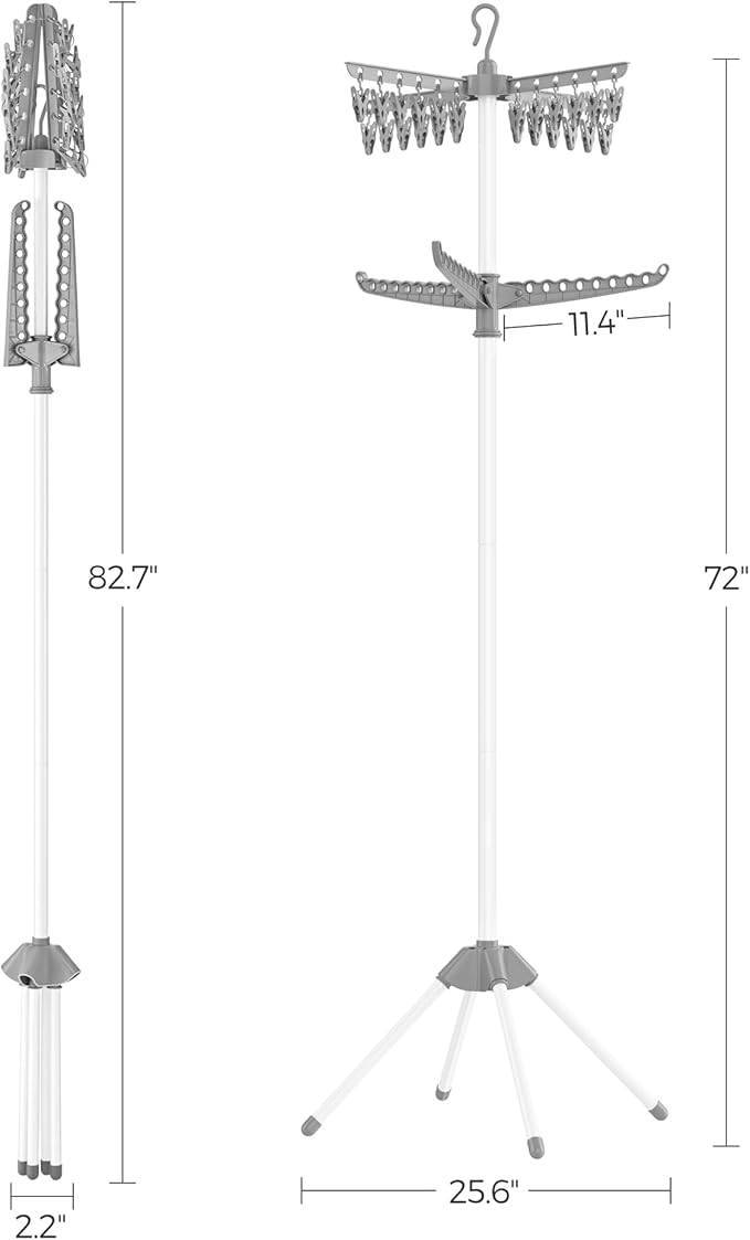 - [Foldable & Space-Saving] Standing at 25.6”D x 25.6”W x 72”H during use, this clothes drying rack takes up little space, perfect for small spaces. Fold the arms and legs into a small size of 2.2”D x 2.2”W x 82.7”H, it will stay out of the way after use
