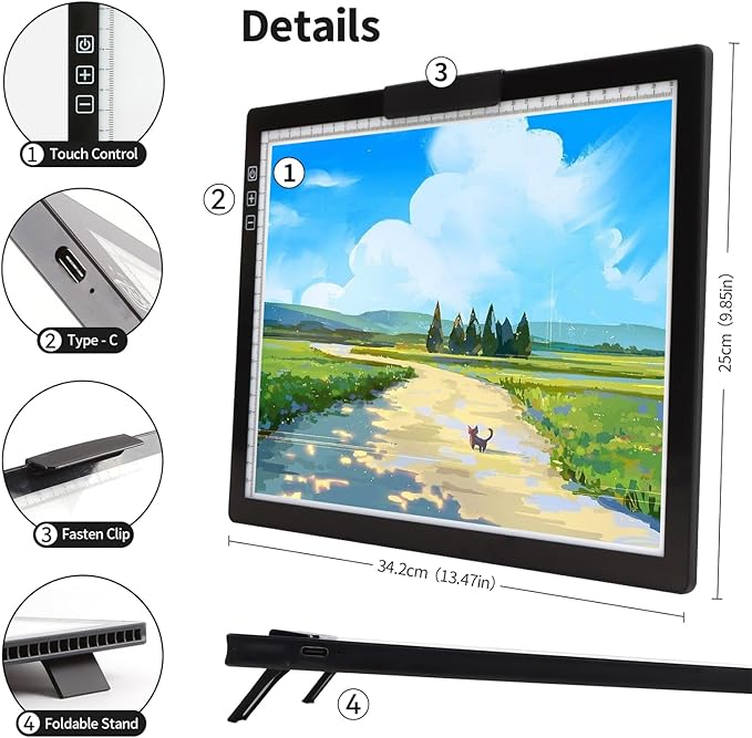 - 【 New Design STAND and Top Fasten Clip 】 The A4 LED tracing pad features with innovative stand, helping you to correct the posture and reducing neck, back and eye fatigue while improving working efficiency. The fasten top clip is designed to hold paper & diamond painting canvas easily, also efficiently complete other projects without placing extra clips any more.