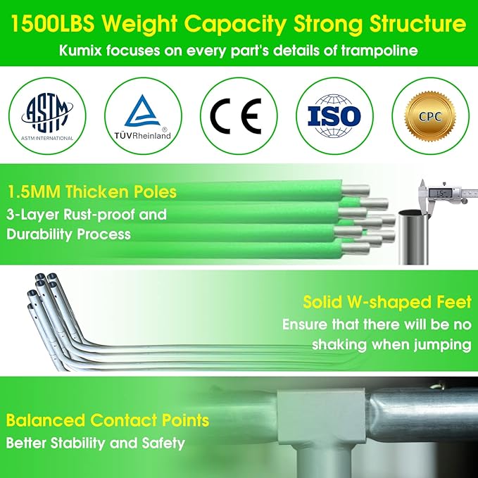 - 1500LBS Heavy Duty Trampoline: This 16ft trampoline frame is structured with 12pcs safety enclosure net poles, 6 W-shaped legs and 108pcs springs which is rare to see in this market. The trampoline is large and strong enough to hold 8-10 kids or 3-6 adults. After various more than 2000times safety and durability tests, our trampolines fully meet all kinds of ASTM, CPC and CPSIA standards. More solid and safer trampoline make you and your children to feel more at ease when using it.
