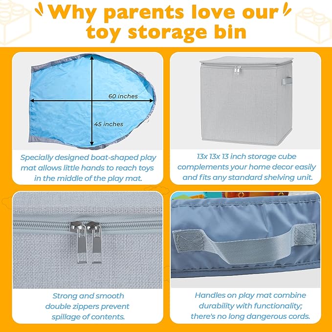 - Safe, Functional And It Has Zippers – There are no tangly cords or buttons to worry about, making it safe for kids of all ages. Our play mat has durable handles for tipping the toys back into the storage bin. We have also included double zippers on the lid so that nothing can spill out accidently. Warning: Children below 3 years of age must be supervised when using this storage bin and its play mat.