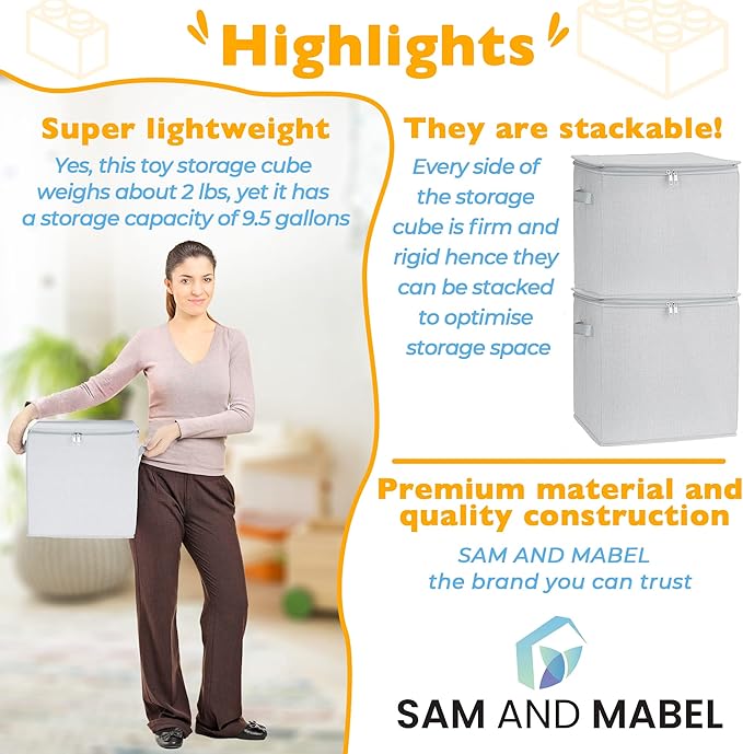 SAM AND MABEL Toy Storage Basket and Play Mat – 13" x 13" x 13" Stackable and Collapsible Cubby Box Organizers for Kids Playroom, Nursery Storage Bins for Boys and Girls (Warm Grayish Beige)