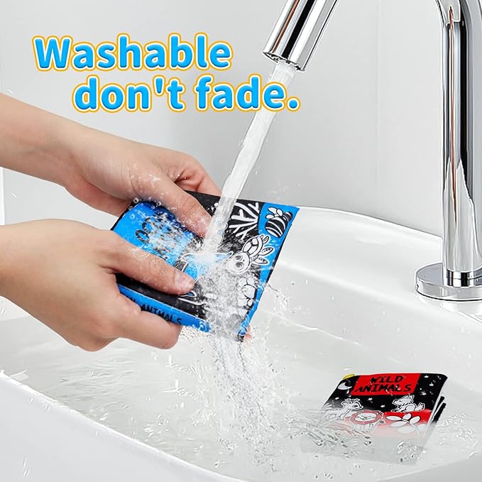 - CARRY IT EVERYWHERE: This soft baby book set is washable and no fading, a perfect bath toy for baby’s bath time. You can hang these soft books on car seat, stroller and crib. An ideal newborn developmental toy for 0 month above
