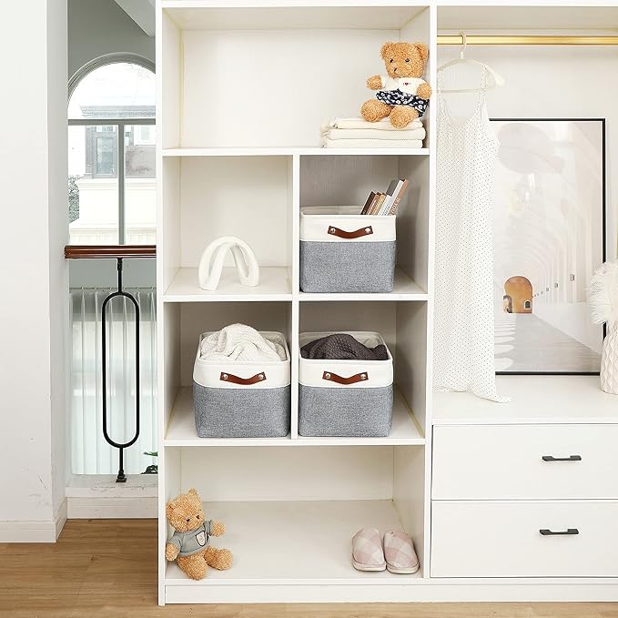 - Decorative Fabric and Vegan Leather – These versatile storage baskets for organizing your everyday life are made with a thick, high-quality fabric and fitted with leather handles to add a stylish touch to a living room, bedroom, office, or personal space.