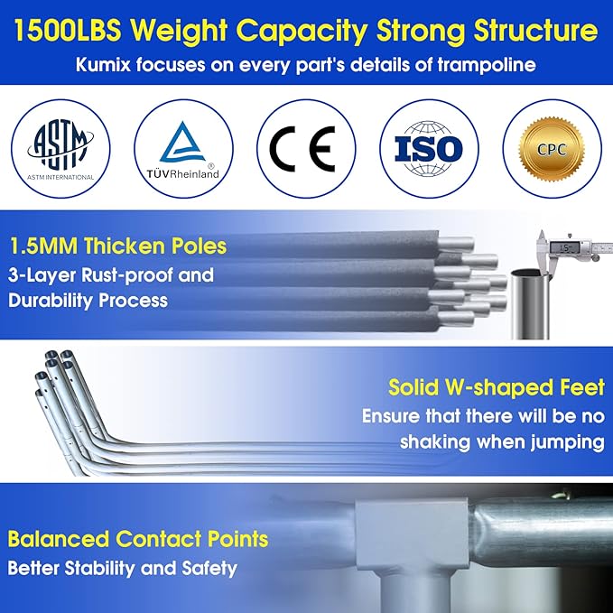- 1500Lbs Max Weight Capacity: Kumix 15FT trampoline passed ASTM F381-16 Standard Safety Specification for Components, and CPC, Chemical Test. Due to the 12PCS heavy-duty galvanized steel frame, 6 U-legs, and 96pcs galvanized springs, the trampoline is sturdy and can hold a capacity of up to 6-7kids. Advise SINGLE person to weigh no more than 330LBS.