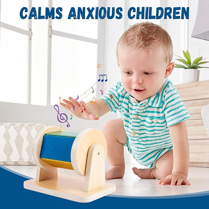 - 🌈【Stimulates Auditory Senses】 The drum contains rolling wooden blocks that produce soft, soothing sounds when spun. It offers multi-sensory stimulation while creating a calm and enjoyable play experience for babies.