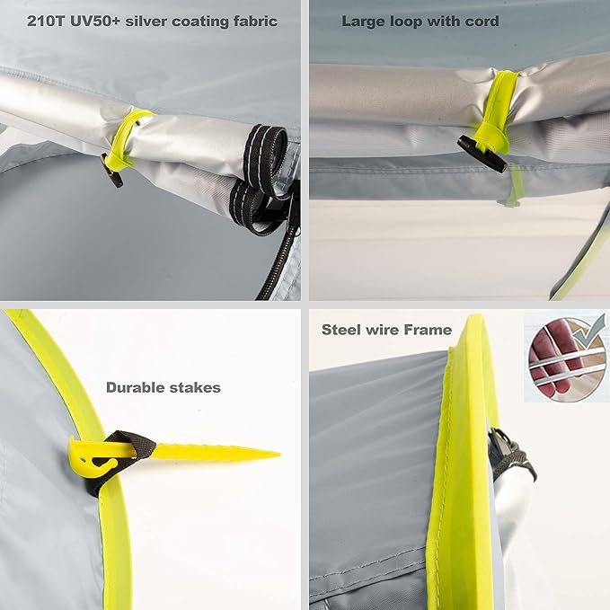 - Special Design- Baby beach tent has several zipper roll ups, it surrounded by breathable on all 4 sides,so you can regulate how much air and sun the baby gets and give him or her more toy hooks on top for hanging lightweight toys