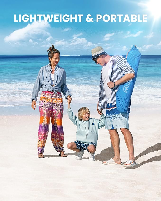 - 9.5MM Thickened Rods & 190T Material: We increased the thickness of the rods from 8.0mm (market standard) to 9.5MM and made with 190T Spring Asia Textile, this beach tent sun shelter is more rugged than other lower ones thus handle the wind firmly and stable without breaking or tearing