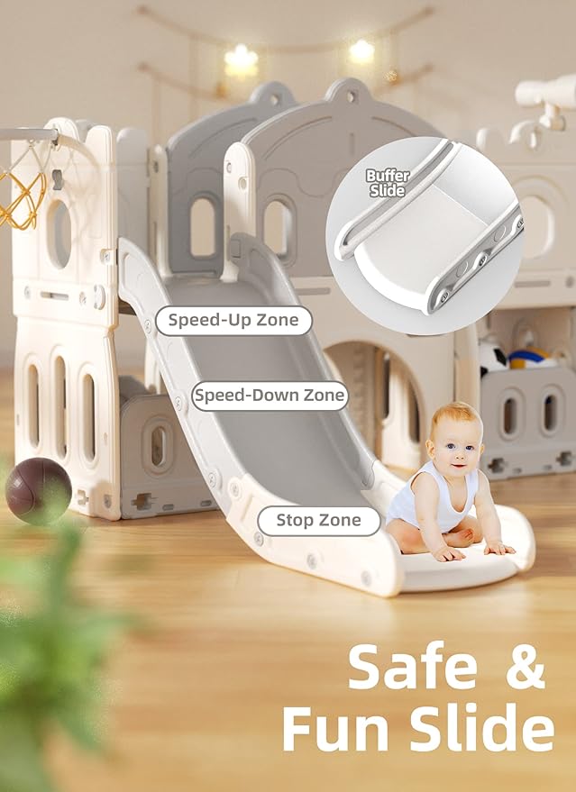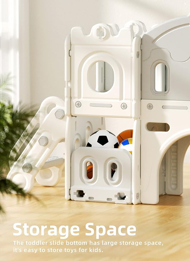 - 7-in-1 Toddler Playground :The toddler slide has 7 activity areas, including stairs, slides, 2 storage spaces, basketball area, aisle, play telescope and climbing area at the bottom
