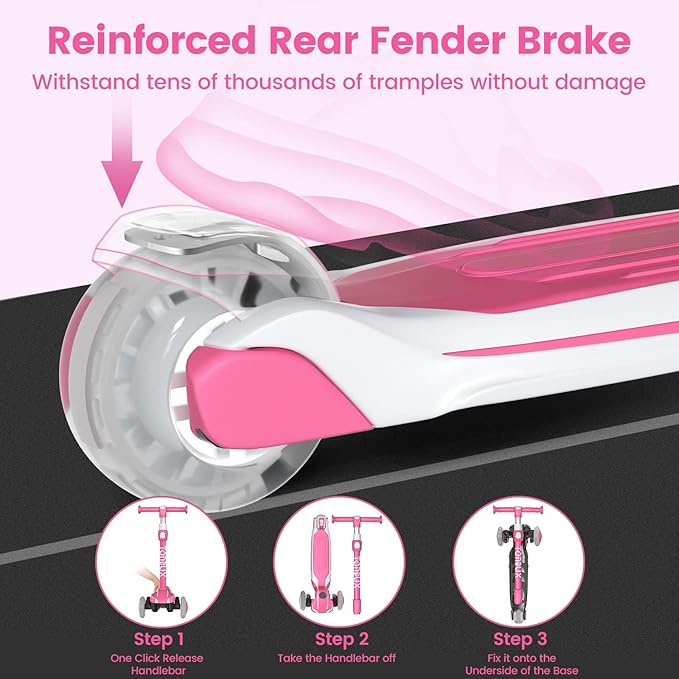 - 【Light Up Kids Ride】Toddler scooter is designed with 3 light up wheels and race car colors. Wheels lights flashing automatically when riding(No batteries required). Your kids will absolutely enjoy a fun and cool ride outside with glaring wheels. If the wheel is damaged, contact our customer service to replace it for free.
