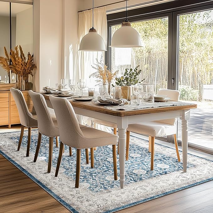jinchan Floral 8x10 Area Rugs for Living Room Machine Washable Vintage Distressed Boho Design Throw Rug Stain Resistant Carpet Low-Pile Thin Non-Slip for Bedroom Dining Room Nursery (8‘x10',Dark Blue)