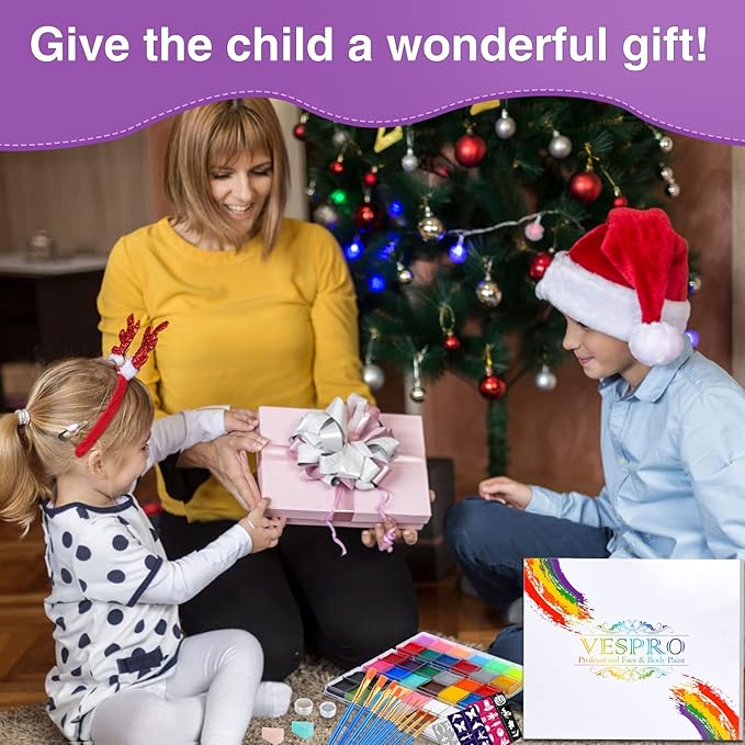 VESPRO Face Painting Kit For Kids Party,32 Colors Professional Oil Face&Body Paint Kit with 10 Brushes 4 Reusable Face Stencils,2 Glitters and 2 Sponges for Kids and Adults Halloween Makeup
