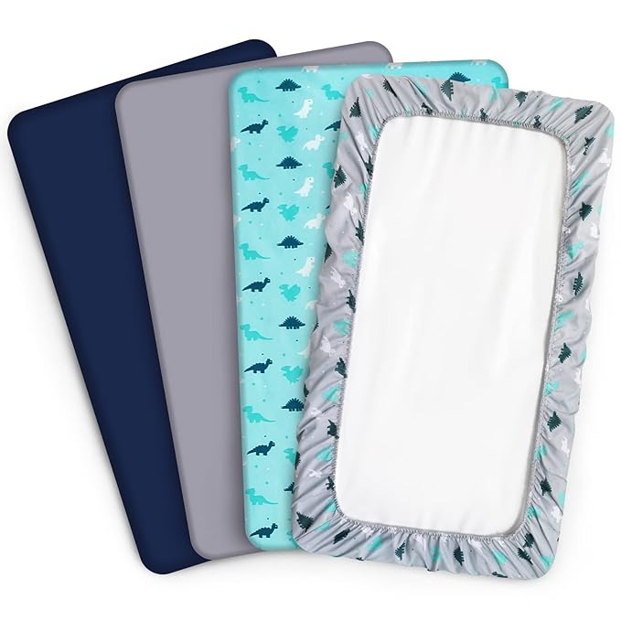 Mini Crib Sheets Set, 4 Pack - Portable Sheets (38" X 24") | Multiuse for Pack n Play, Playard, Playpen, Crib - Dinosaurs