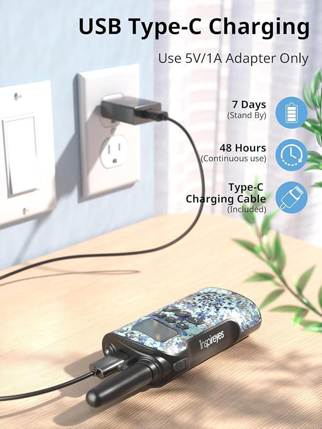 - Inspireyes rechargeable kids walkie talkies are rechargeable and long lasting, featuring an upgraded built-in lithium polymer battery. There is no need to buy extra AAA batteries. Kids can enjoy up to 48 hours of playtime and 7 days of standby on a single charge.
