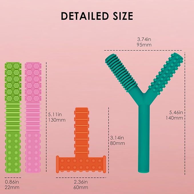 - FUN TEETHING TOYS: Our sensory teething toys set includes 1 pcs T shaped, 1 pcs Y shaped sensory chewy toys and 2 pcs teething tubes, helps keep your kids from chewing on fingers, pencils, hands, clothes, hairs, etc. Reducing stress, anxiety especially when they need to soothe, calm, or focus