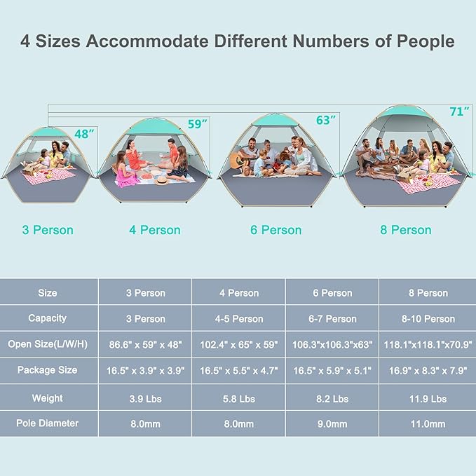 - Super Large Space: Size of 106.3"L x 106.3"W x 63"H, 30% bigger than other POP-UP tent at similar price, fits 6-7 person. It provides a comfortable space for family and friends on the beach