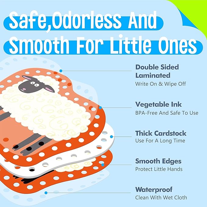 - Premium Material: The lacing cards are made of sturdy cardstock, durable and handy. Double side printed with premium plant ink, non-toxic and no odd smell, safe enough for toddlersβ use. The laces are made of quality polyester, which is not simple to break, and can serve you for a long time.