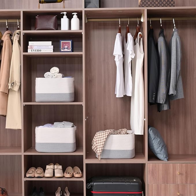 Storage Baskets for Organizing Shelves, Woven Cotton Rope Bins for Baby Nursery Organization, Book Toy Towel Organizer, 15"x11"x9.5", 3 Packs, Off White & Grey