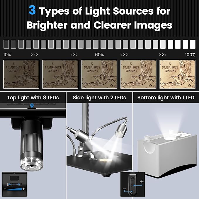 - 【Versatile LED Illumination】: Featuring three types LED illumination with adjustable brightness, you can easily customize the lighting effects according to your needs. The top light and side lights are suitable for observing coins and soldering, while the bottom light is ideal for viewing biological slides. AD210 is versatile and adaptable to various usage scenarios
