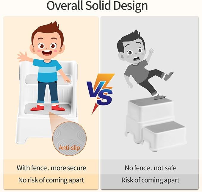- 【Stable, Anti-slip,Eco-friendly】The well-designed "A" type stable structure、 this step stool in the top layer with a raised guardrail, to prevent stepping on the accident; at the same time, the pedal standing area of 11.5x5.5 inches per layer, effectively prevent the pedal area caused by small backflip fall; climbing ladder in each use of the bottom surface is equipped with a non-slip strip, to ensure that the normal use of the bathroom or wet floor、Our toddler helper stools are made of non-toxic PP, durable and BPA free.