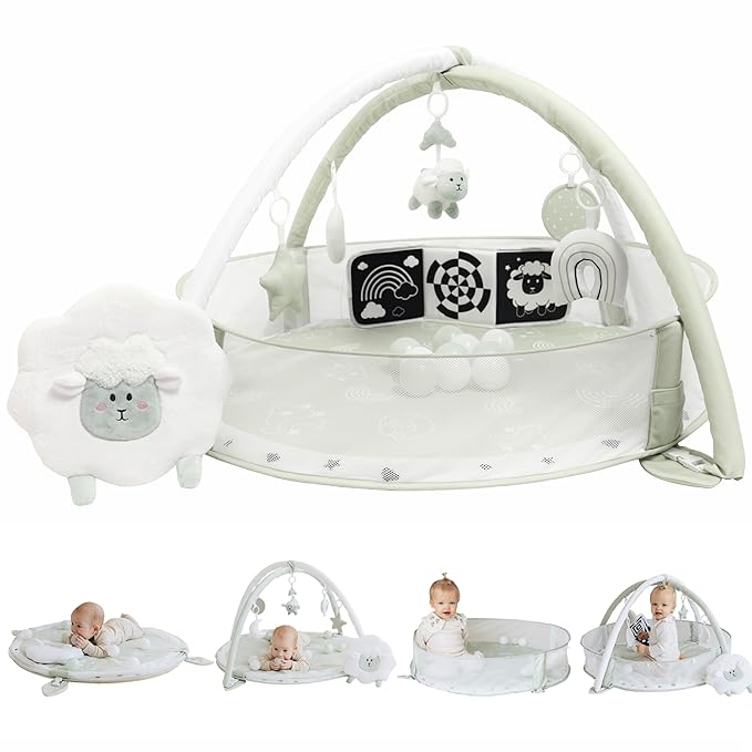- πΌ {Adaptable} This versatile baby playmat encompasses 6 different uses: tummy time mat, baby activity center, pop up mesh fence, high contrast book, ball pit with balls included and lamb storage bag. Engineered to align with your baby's developmental stages, this mat will capture your baby's attention providing hours of both entertainment and learning. Caution: Always ensure adult supervision during use.