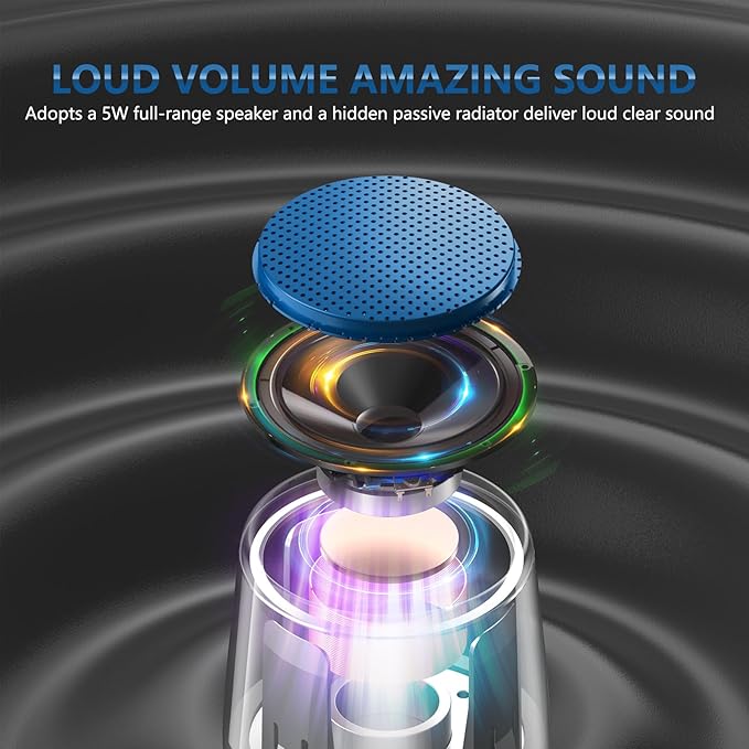 - 【Small But Mighty Powerful Mini Speaker】 This micro travel waterproof speaker packs a far more powerful punch than its small size would suggest. It adopts a 5W full-range speaker and a hidden passive radiator on the bottom to deliver surprisingly rich audio and clear sound. Wireless computer speaker without cable hassle for pc laptop, tablet, and smartphone. One of the best gift ideas.