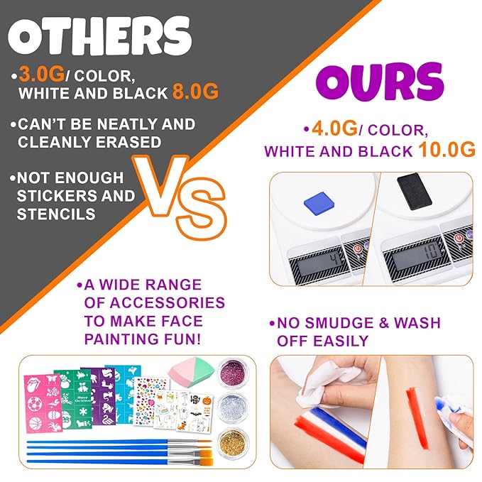 - EASY TO USE AND WASH OFF - The high-quality formula ensures that vibrant colors easy to apply and won't fade or smudge. When the fun is over, the washable face paint effortlessly comes off with mild soap and water or wet wipes.