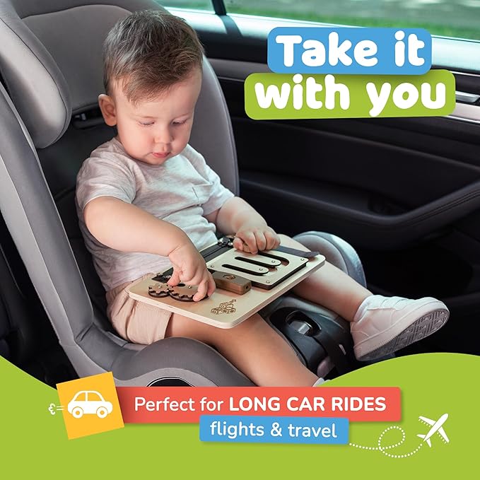 - Montessori Busy Board for 1 Year Old – Our sensory board for toddlers features engaging activities that enhance fine motor skills, problem-solving, and cognitive growth. Designed as an educational toy, it helps kids practice essential life skills. Lightweight and travel-friendly, this toddler busy board is perfect for screen-free play at home or on the go.