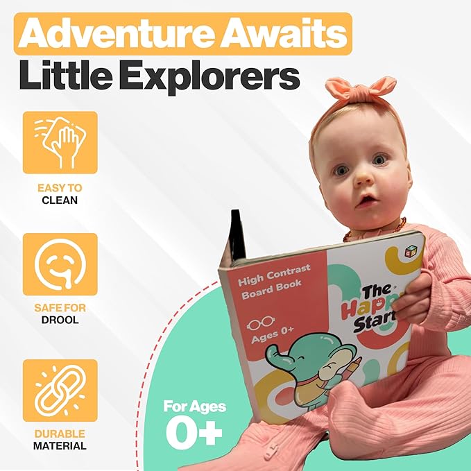 Happy Start Award-Winning High Contrast Board Book - Newborn Black & White Baby Cards, Easy to Clean, Hospital Approved, Stands on Its Own, Tummy Time Toy, Ages 0+ (English)
