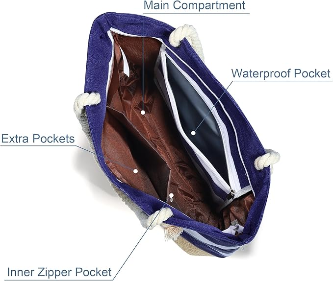 - 【LARGE CAPACITY AND INNER POCKET】: Our beach bags measure 18.9"* 5.5"* 14.41" and have plenty of space to store beach towels, extra clothes, shoes, food, water bottles and more. Inside the tote bag, there is a small pocket, suitable for holding keys, cell phones, wallets and other small valuables. Beach bag holds everything you & your family need